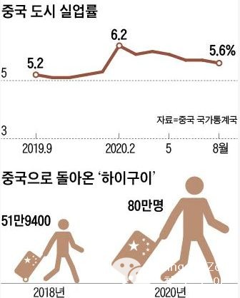 올해 중국 대학 졸업생은 작년보다 40만명 늘어난 874만명으로 역대 최대다. 반면 상당수 기업은 코로나 충격으로 채용 인원을 줄였다. 아예 감원에 나서는 곳도 있다. 지난 2월 6.2%까지 치솟았던 중국 도시 실업률은 8월 5.6%까지 떨어졌지만 여전히 코로나 전보다는 0.5%포인트 높다. 중국 정부는 사회 불안 원인이 될 수 있는 청년 실업 문제에 촉각을 세워왔다. 시진핑 중국 국가주석은 지난 7월 “대졸자 취업을 위해 천 가지 방법과 백 가지 계획(千方百計·최선을 다하라는 뜻)을 동원하라”고 했다. 중국 정부는 도시에서 노점을 장려하고, 농촌에 교육·보건 일자리를 만들어 도시 청년을 보내는 ‘하방(下放) 정책’까지 펴고 있다. 이런 상황에서 하이구이들까지 대거 귀국하면서 중국 국내 대졸자들과 경쟁이 불가피해졌다.